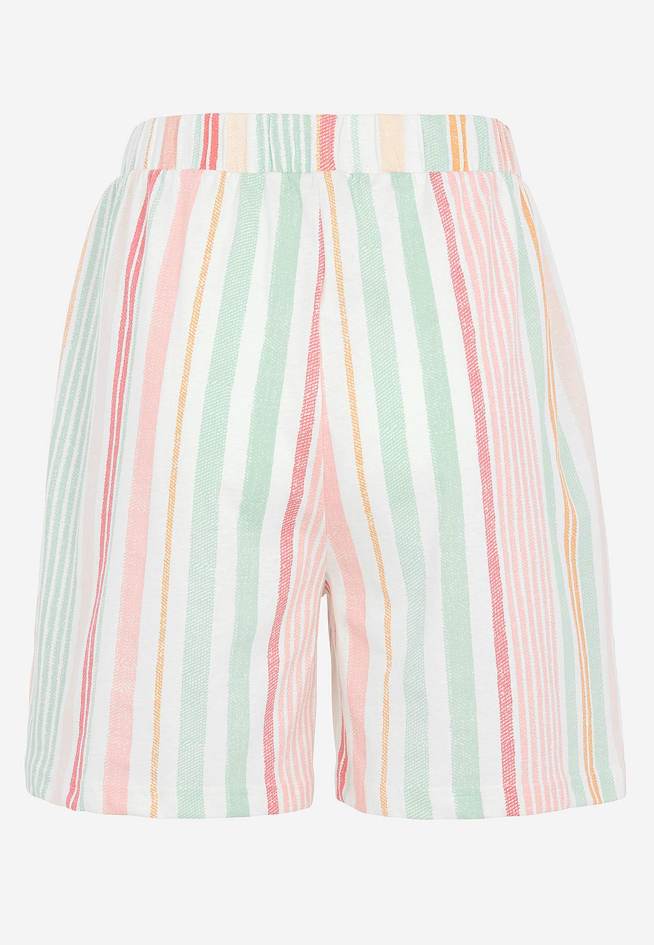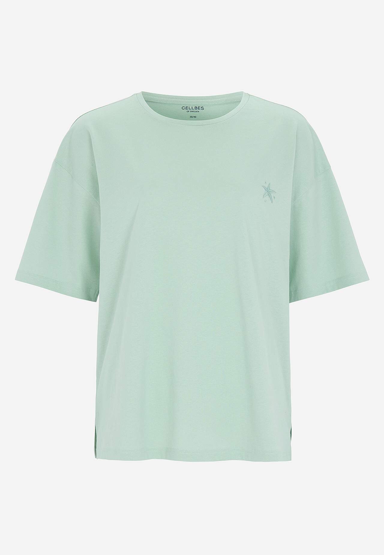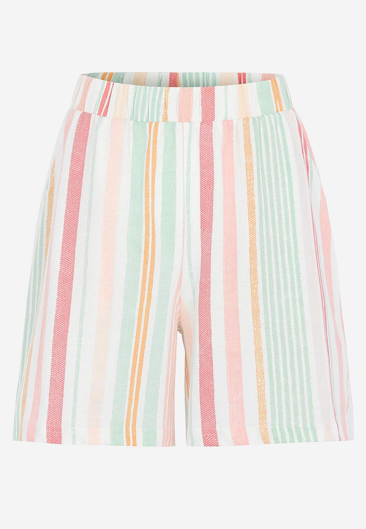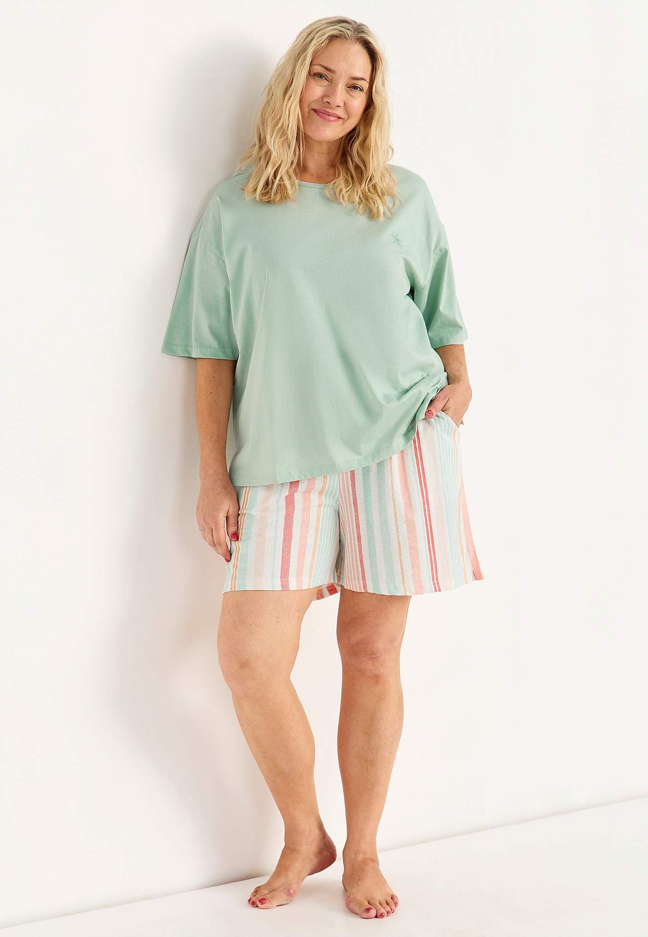 Schlafanzug mit kurzärmeligem Top und einer Shorts. Weiche, organische Baumwolle. Normale Passform. Oberteil: T-Shirt mit leicht überschnittener Schulter. Kleines Stickerei-Detail im gleichen Farbton auf der linken Seite. Kurze Ärmel. Gerader Saum mit Schlitz an den Seiten. Die Länge hinten hängt von der Größe ab und liegt ... Mehr erfahren