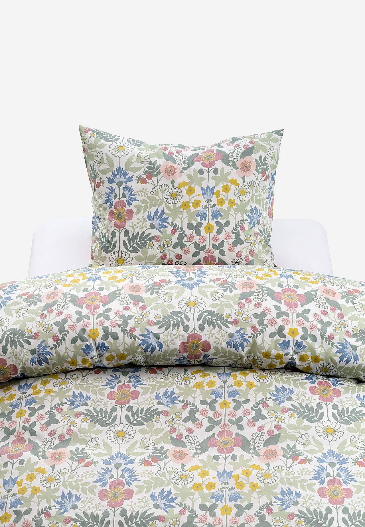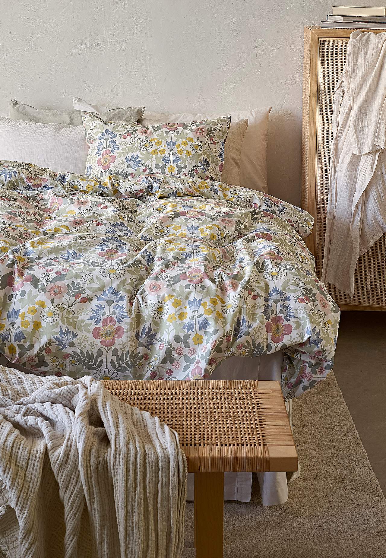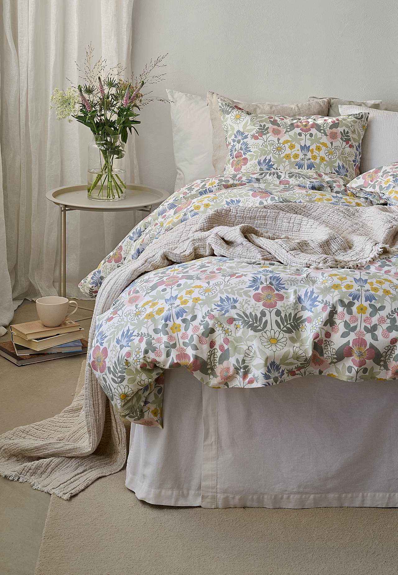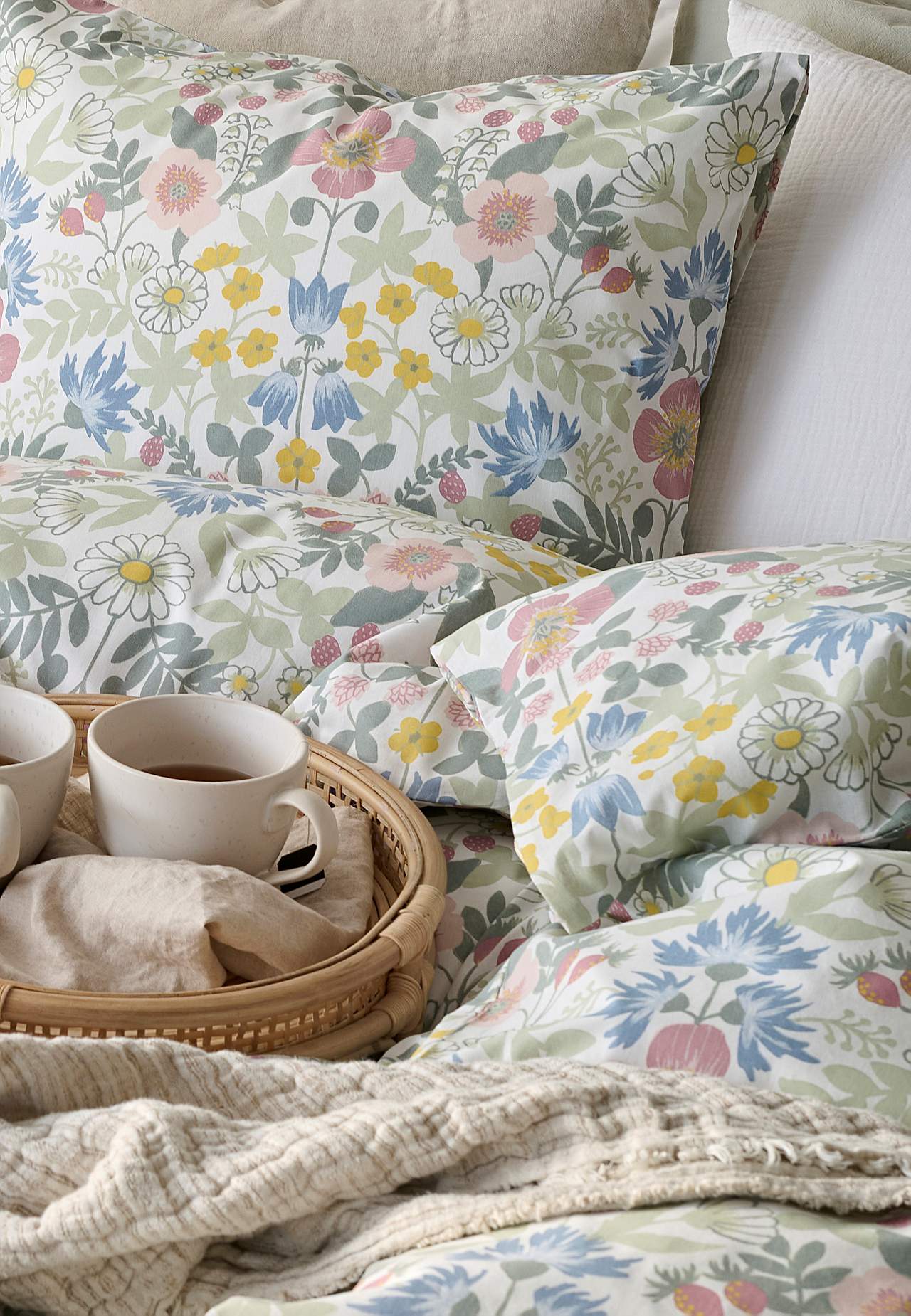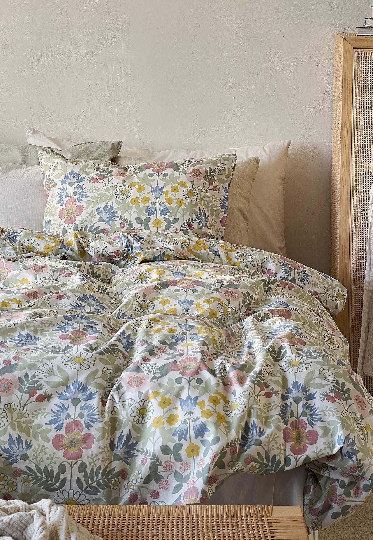 Bettbezug-Set aus weicher, hübscher Baumwolle. Gedruckte Bettgarnitur mit Muster mit kleinen Blumen und einfarbigem Hintergrund. Gleiches Muster auf Vorder- und Rückseite. 2 Stück. Bettbezug 150x210 cm groß, Kopfkissenbezug 50x60 cm groß. Bettbezug mit Öffnungen für Hände an der Oberseite. Kopfkissenbezug mit Hotelverschlus... Mehr erfahren