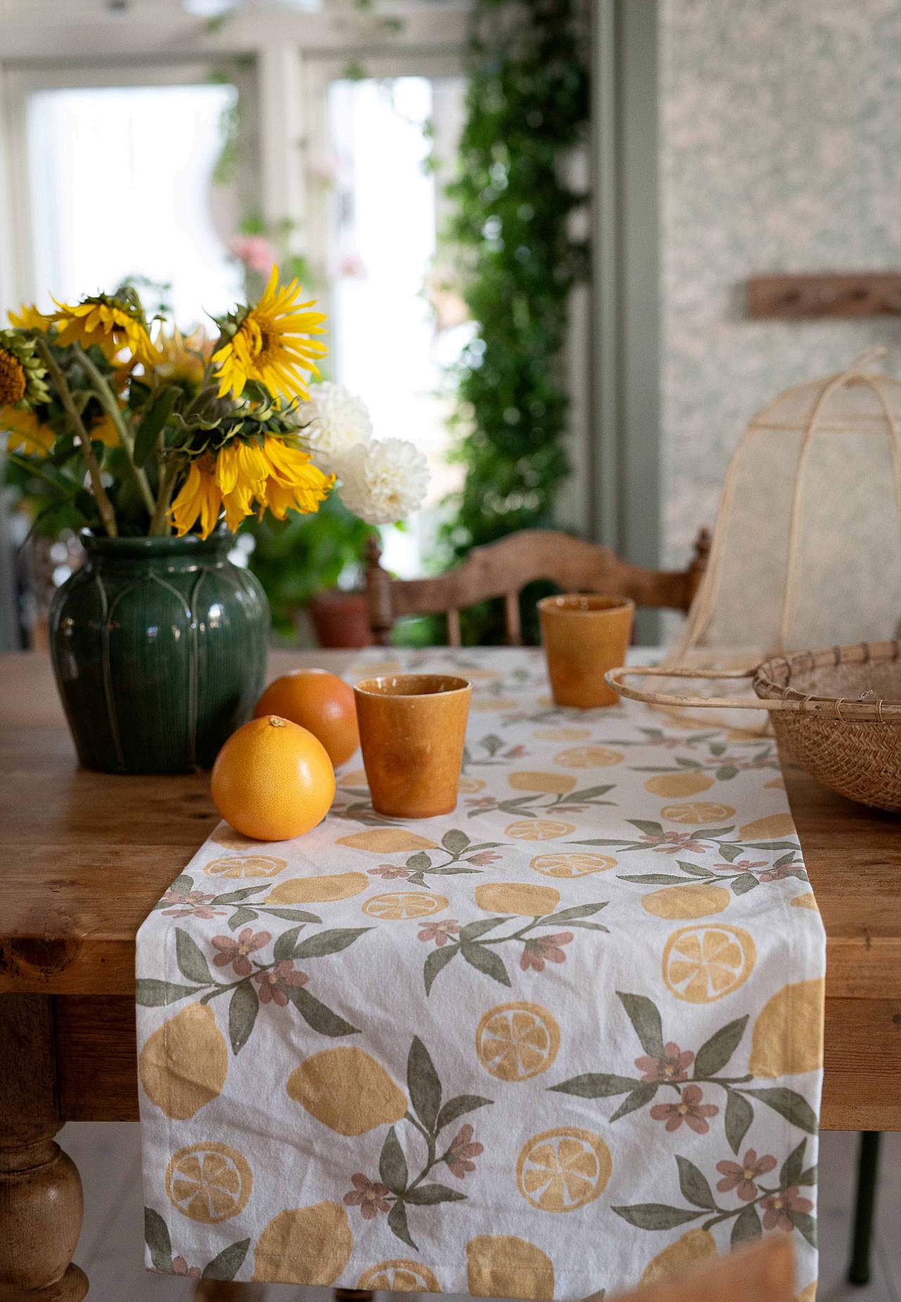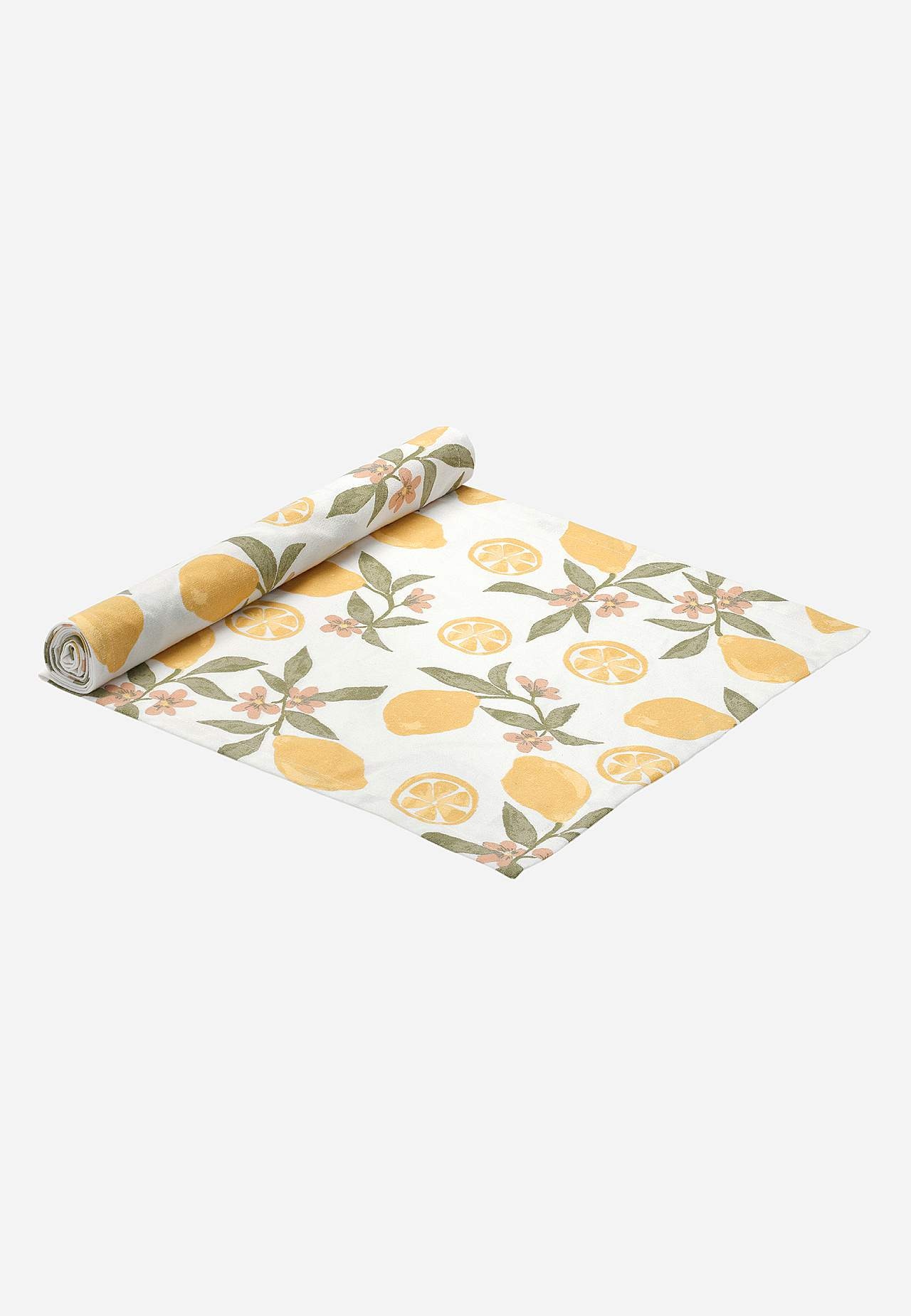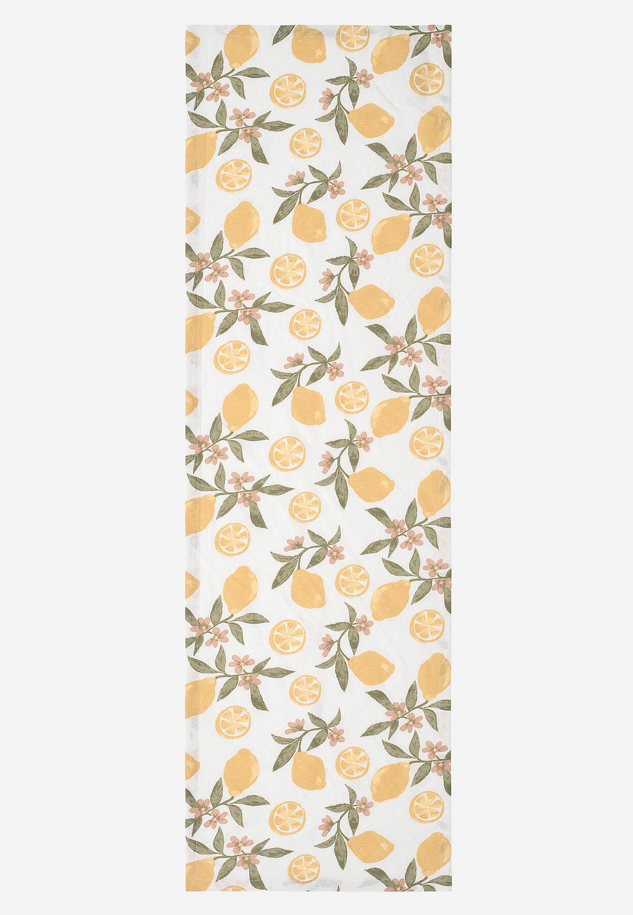 Läufer mit süßem Zitronen-Aufdruck und kleine Blumen mit Blütenblatt. Glattes Material aus recycelter Baumwolle und Polyester. Saum rundum. Größe: 40x140 cm.