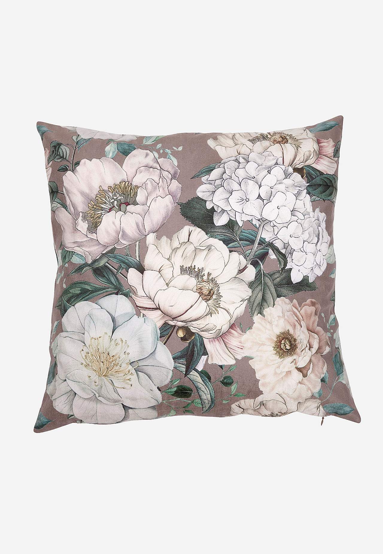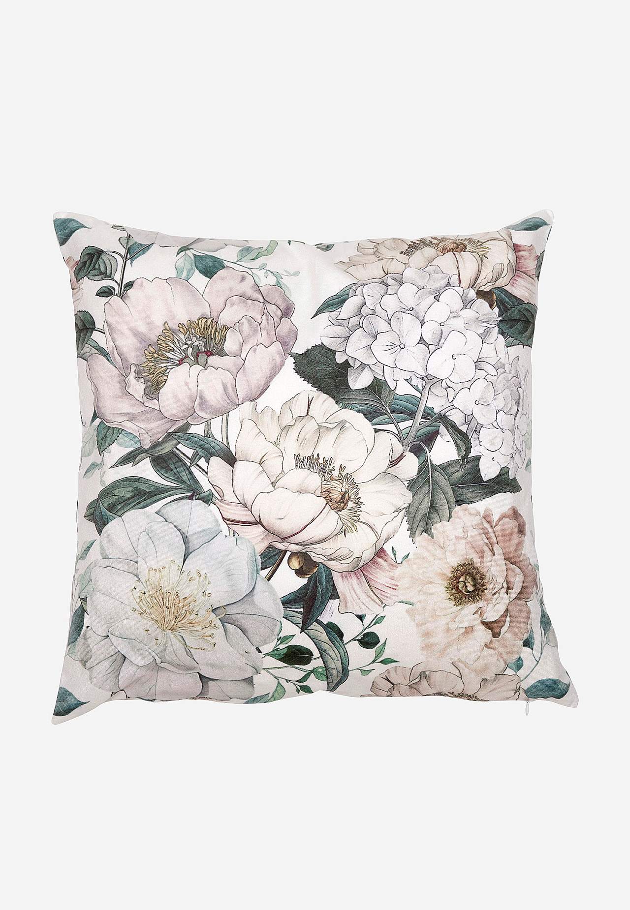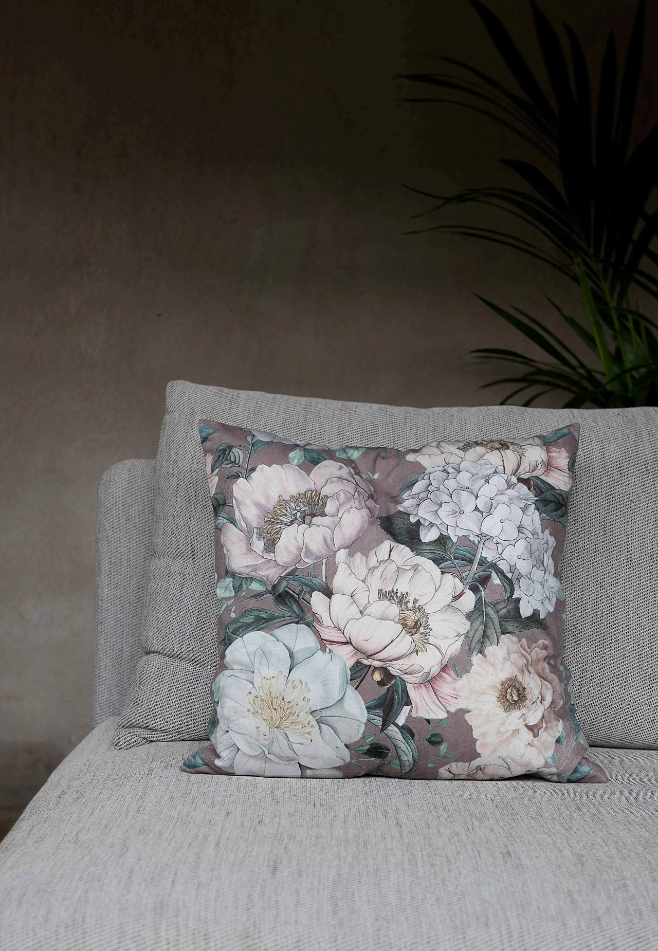 Kissenbezug mit schönen Pfingstrosen und Hortensien. Weicher Samtstoff aus Polyester. Gleiches Muster auf Vorder- und Rückseite. Seitlicher Reißverschluss. Größe: 45x45 cm.