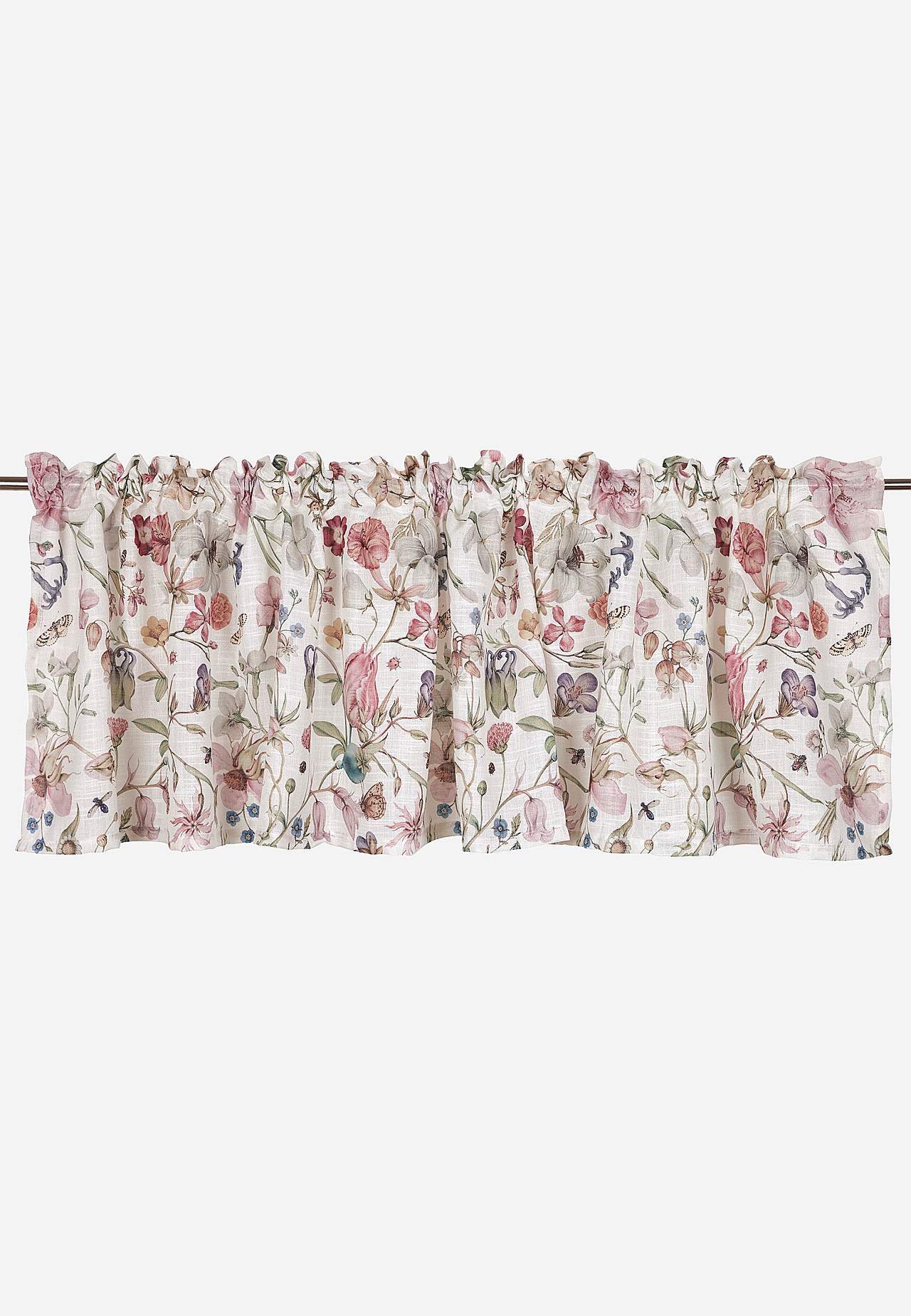 Schabracke mit gedruckten Blumen und Schmetterlingen. Material mit nettem Faltenwurf. Eingewebte Slub-Fäden verleihen eine schöne Struktur. Gute Lichtdurchlässigkeit. Der Aufdruck ist auf der Rückseite deutlich sichtbar.
