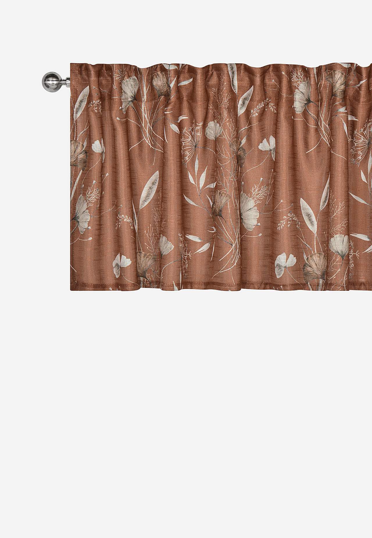 Schabracke mit digital gedrucktem Muster mit durchsichtigen Blumen und Stielen. Dünn gewebter Stoff mit etwas stärker eingewebten Slub-Fäden, die für eine schöne Struktur sorgen. Gute Lichtdurchlässigkeit. Der Aufdruck ist auf der Rückseite ziemlich gut sichtbar.