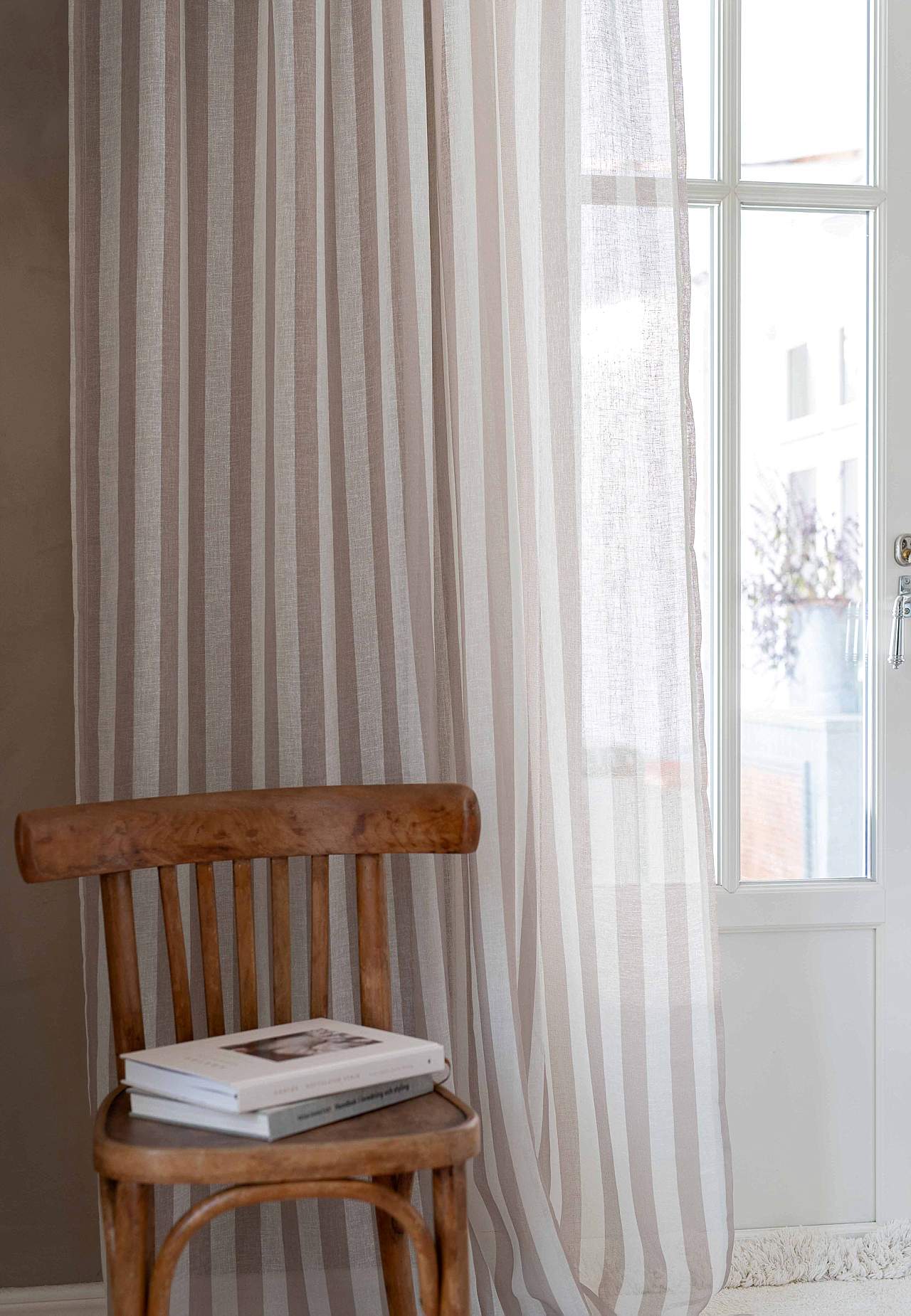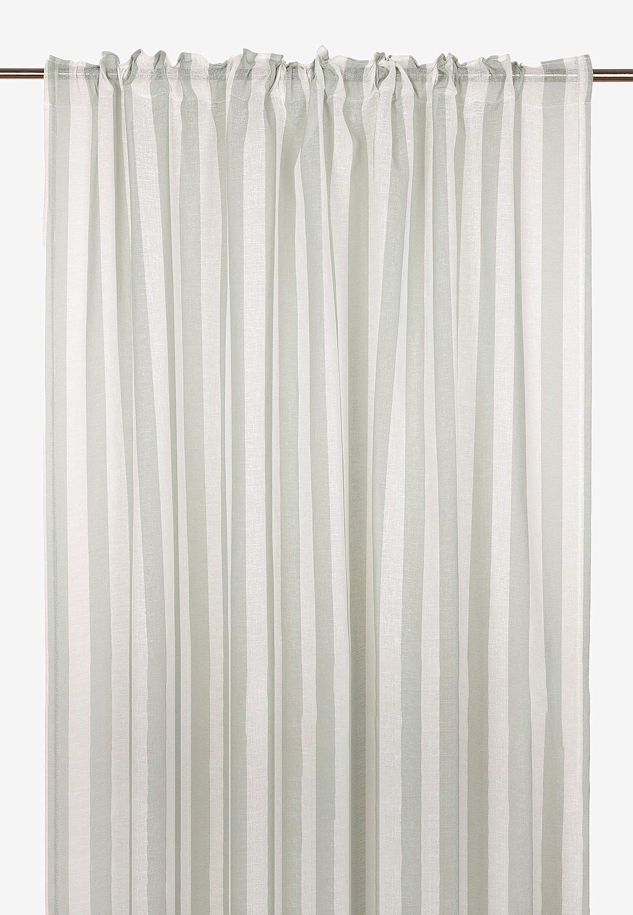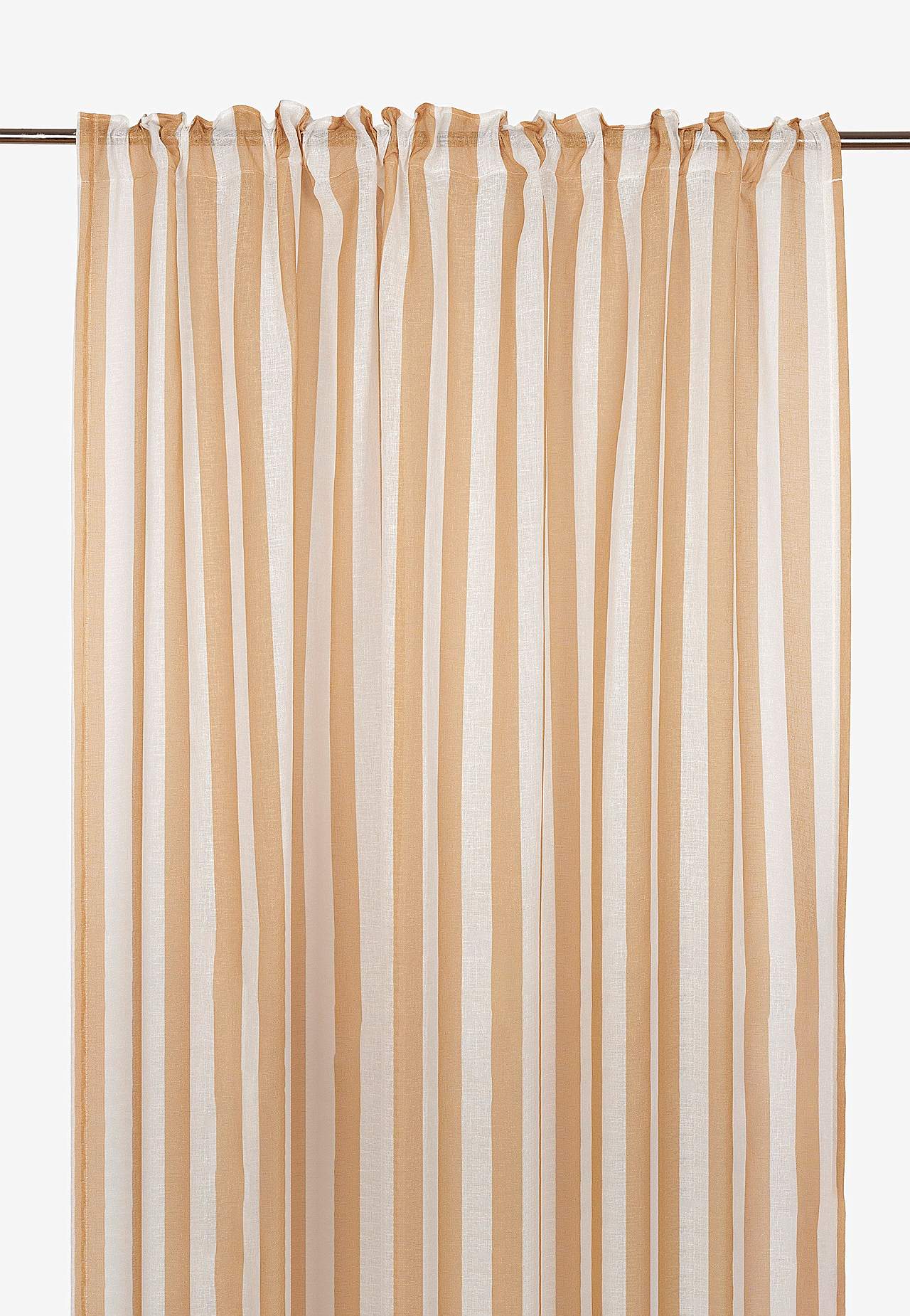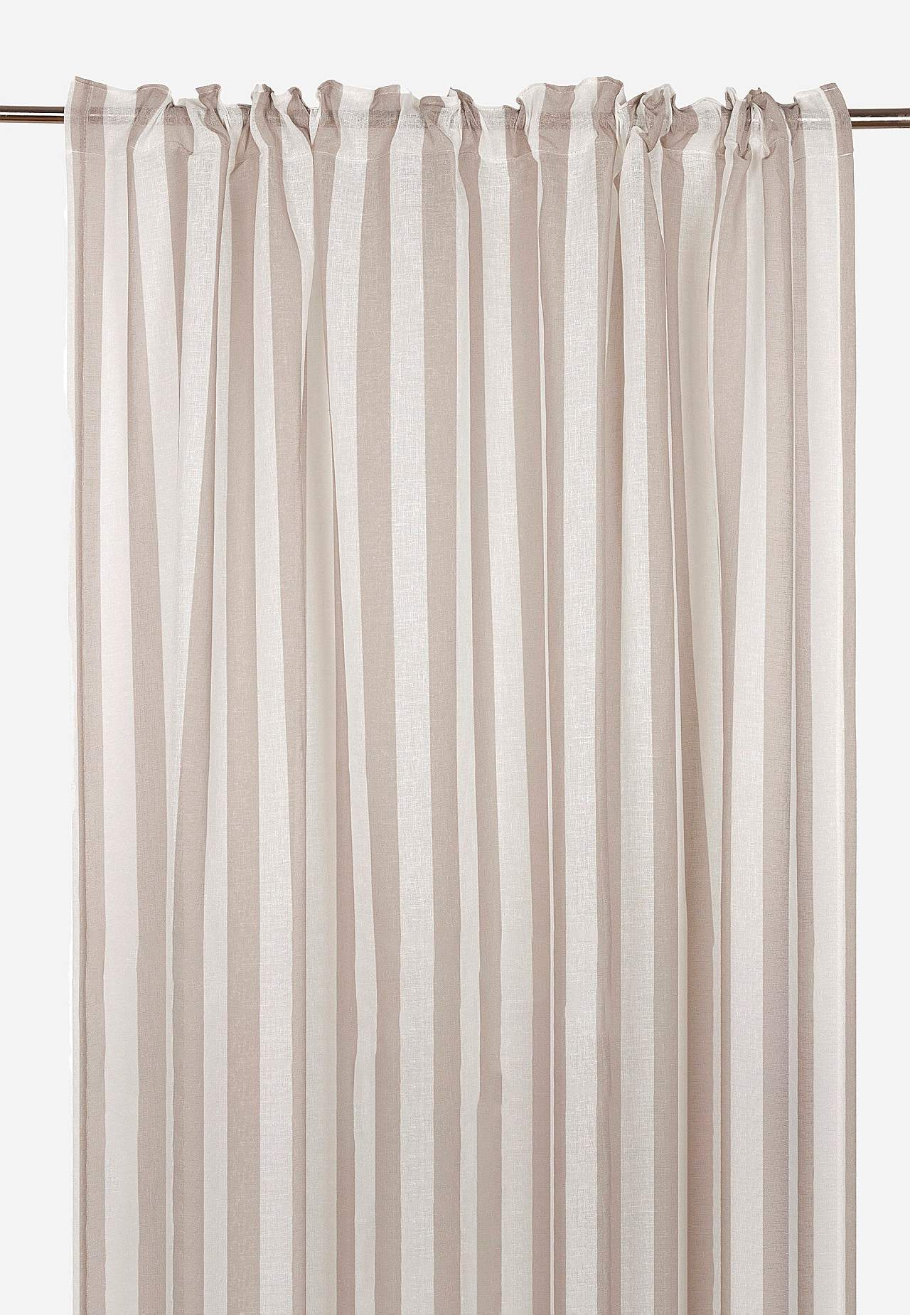 Vorhang-Paneele mit digital gedrucktem Streifen. Luftiges Material mit nettem Faltenwurf und fein eingefädelt Slub-Stoff. Gute Lichtdurchlässigkeit. Der Aufdruck ist auf der Rückseite deutlich sichtbar. Gekettelte Naht.